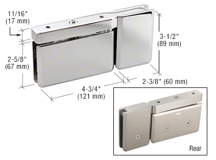 • The combination of this CRL 135 Degree Prima Hinge with U-Clamp at the top of the enclosure allows the installer to mount a shower door next to an adjacent 135 degree fixed panel without a header. The same may be done at the bottom of the door, or a standard PPH01 Model may be used with the door, with a separate U-Clamp or U-Channel used at the bottom of the panel. Stocked in six popular finishes, and used with 3/8" or 5/16" (10 or 8 mm) thick tempered safety glass.