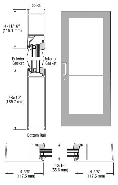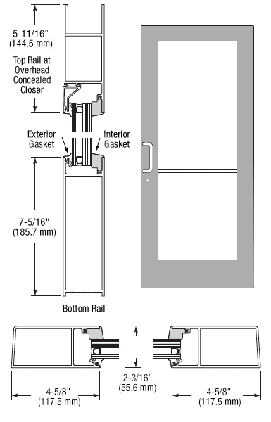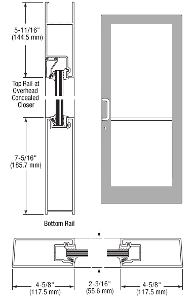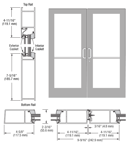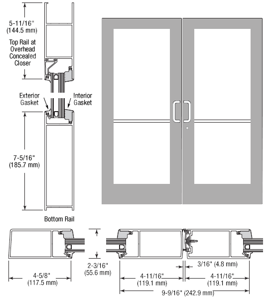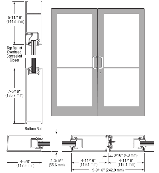 • This CRL Custom Medium Stile Entrance Pair is built with 4-5/8" (117 mm) stiles, 5-11/16" (144 mm) top rail, and 7-5/16" (186 mm) bottom rail. Standard features include stiles for butt hinge hardware, glass stops for 1-5/16" (33 mm) impact glazing (by others), deadbolt, flush bolts, keyed cylinder exterior, and thumbturn interior. prepped for concealed overhead closer.