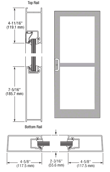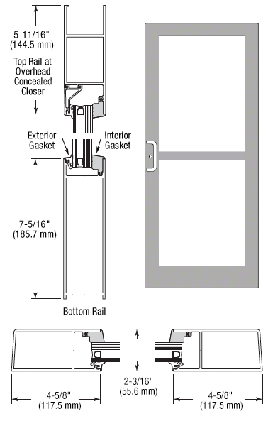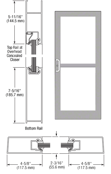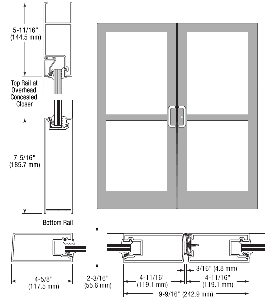 • This CRL Custom Medium Stile Entrance Pair is built with 4-5/8" (117 mm) stiles, 5-11/16" (144 mm) top rail, and 7-5/16" (186 mm) bottom rail. Standard features include stiles for butt Hinge hardware, glass stops for 1-5/16" (33 mm) impact glazing (by others), ready for of selected panic device, and prepped for concealed overhead closer.