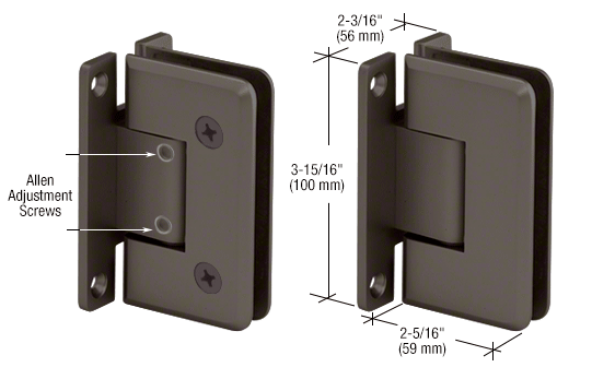 • The CRL Adjustable Cologne Series has taken our popular Cologne Hinge to a new level. Adjustment to accommodate the desired angle (up to 90º) is done after the door is installed. Once the door is hung, simply loosen the Allen set screws and turn the door to the desired closed position. By merely tightening the Allen screws your door will self-center to the desired angle. The door can swing 90º inward and also 90º outward (adjusting angle from factory set position will reduce 90º swing in that direction). For doors pulling outwards only (using a clear door jamb), you can adjust the hinge to close 5º inside the shower area, thus having the door close snugly against the jamb.